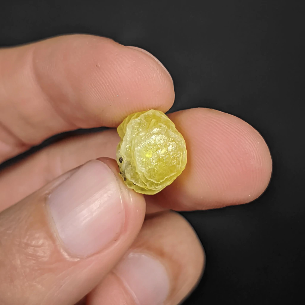 Exemplar paquistanês do mineral brucita, variedade de coloração amarelo-saturado, com brilho perolado a ceroso, formado por um agregado de finas camadas de hábito cristalino lamelar sobrepostas. Apresenta translucidez e crescimento cristalino globular. Possui 1,2 cm. Considerado extremamente raro e valorizado em coleções de minerais.