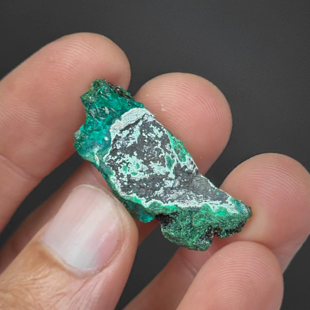 Rara associação dos minerais dioptásio, de cor verde-esmeralda saturada, cristais romboédricos agrupados bem formados e brilho vítreo a subadamantino; e malaquita, de tonalidade verde-escuro, hábito cristalino acicular (finos cristais agrupados) e brilho aveludado. Com 3,2 cm, trata-se de uma composição de rara ocorrência procedente da RD Congo, de belo contraste visual e altamente valorizada em coleções.