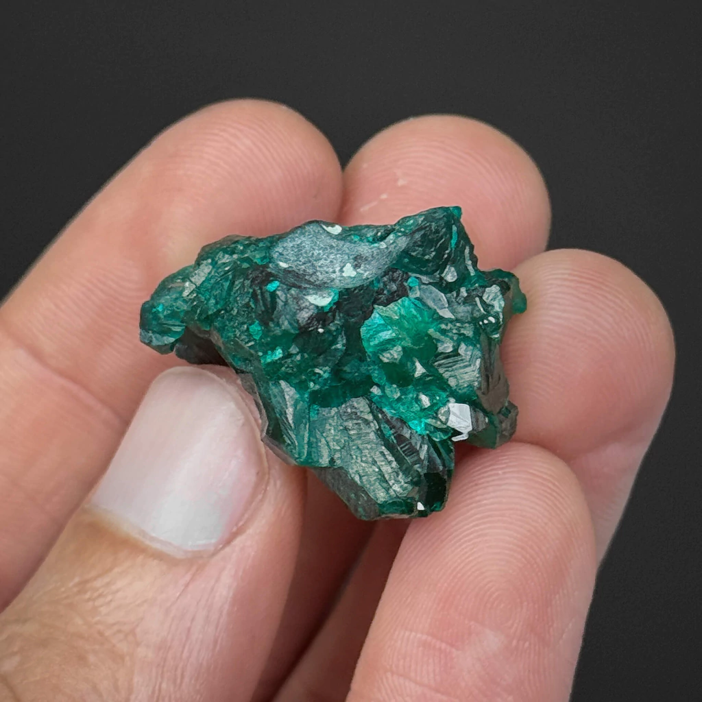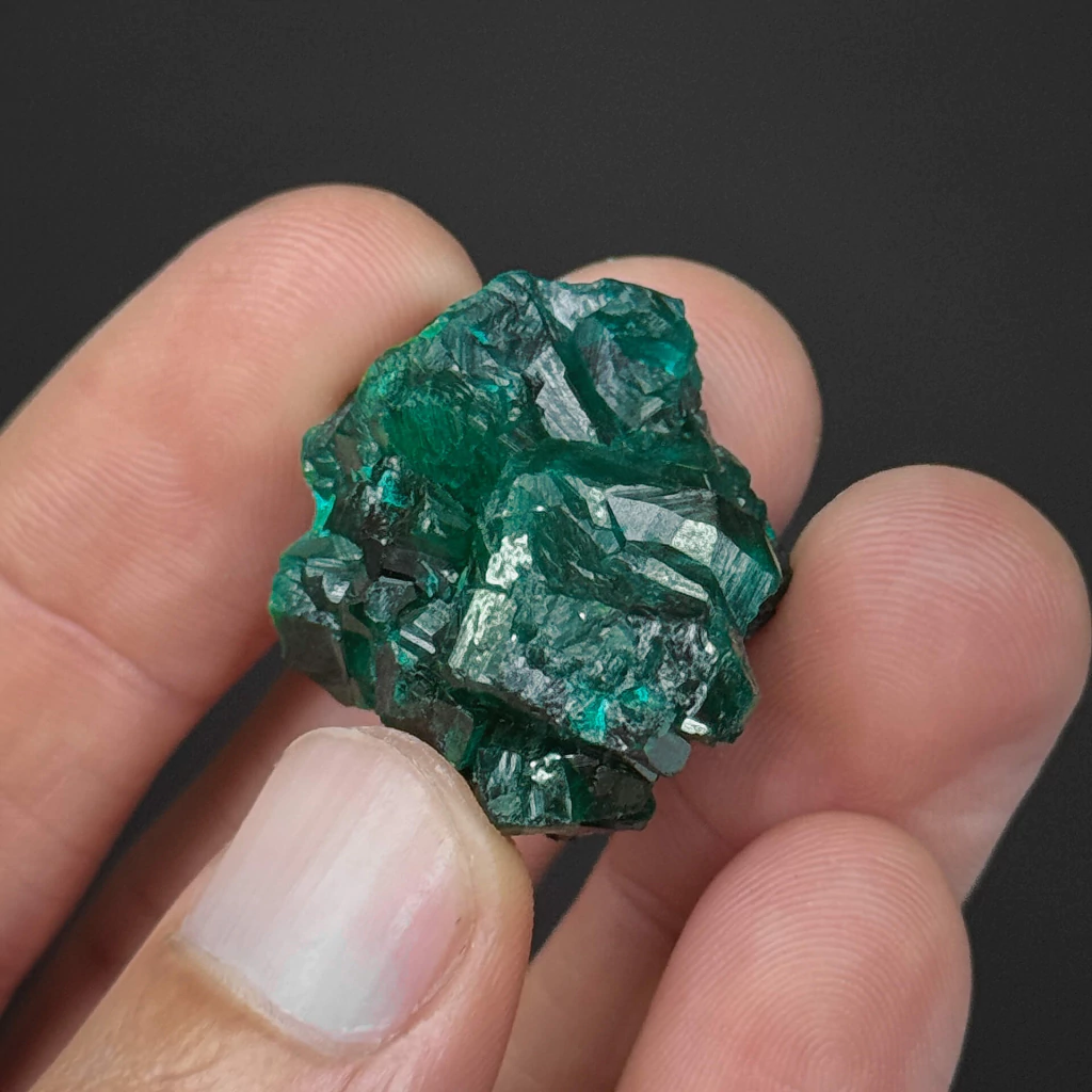 Exemplar do mineral dioptásio, de cor verde-esmeralda saturada, exibindo cristais romboédricos agrupados e bem formados, com brilho vítreo a subadamantino e translucidez. Com 2,5 cm, trata-se de uma rara ocorrência mundial procedente da RD Congo, de cor marcante e altamente valorizada em coleções.