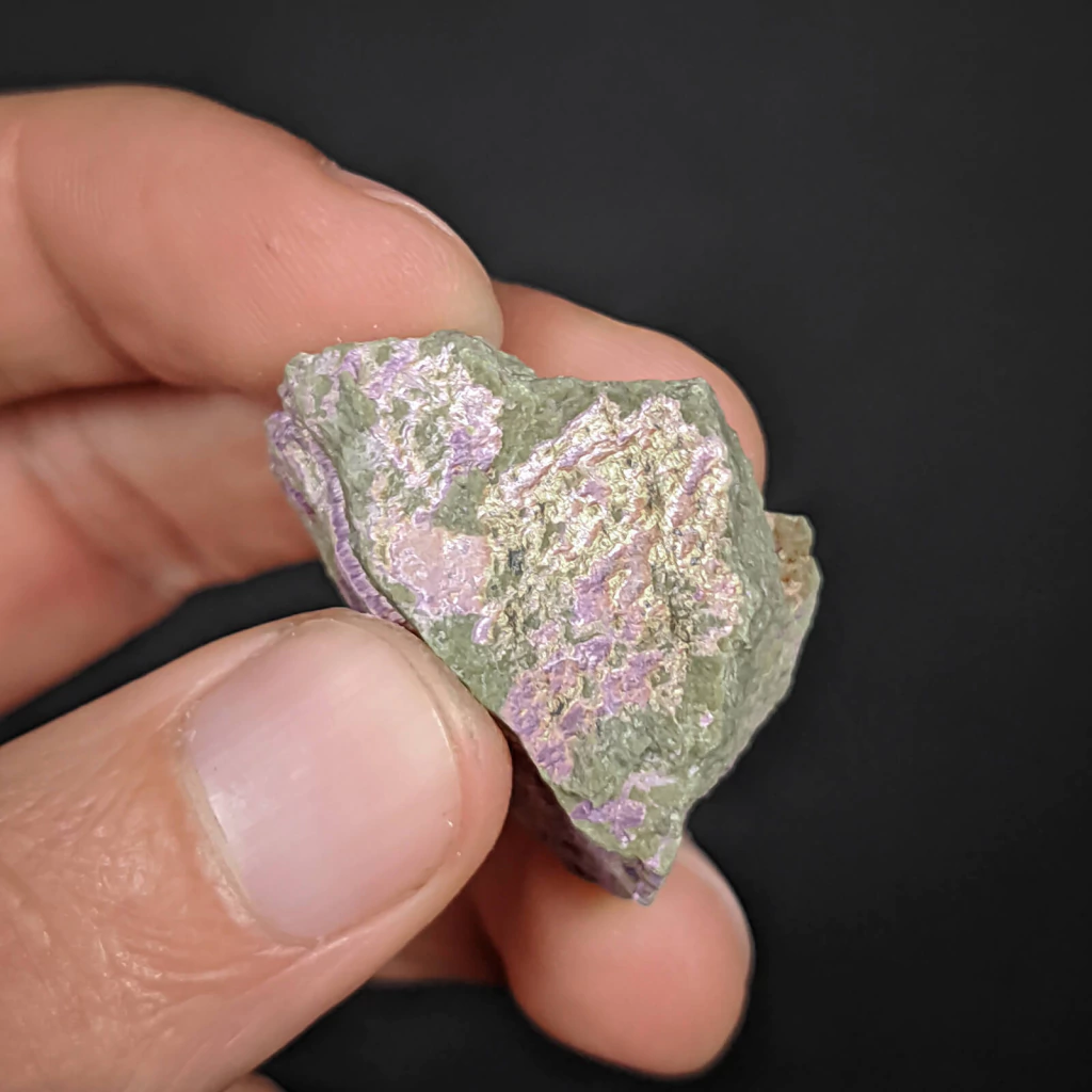 Exemplar australiano de atlantisita, uma rocha composta essencialmente pelos minerais stichtita arroxeada e uma serpentina não identificada de cor verde. Seu nome é comercial, e muitas vezes é chamada apenas de "stichtita com serpentina". Possui 3,5 cm e é valorizada em coleções, joalheria e usos decorativos naturais.
