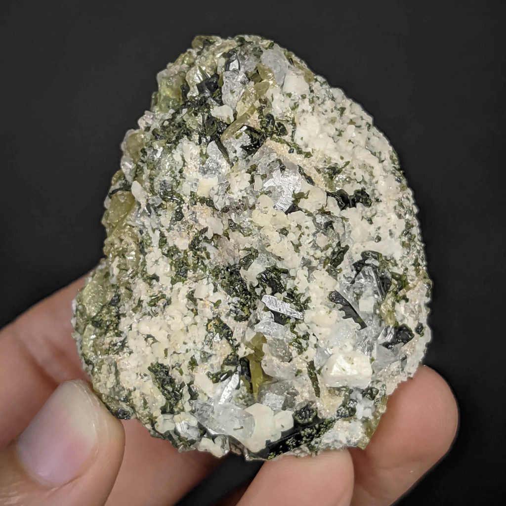 Exemplar do mineral titanita, também conhecido como esfênio, de cor verde-amarelado, acompanhado pelos minerais epídoto verde-escuro, albita branca e quartzo incolor. Esta peça possui 6,2 cm. De origem brasileira, essa associação multiespécie mineral é rara, bem cristalizada e altamente valorizada em coleções.