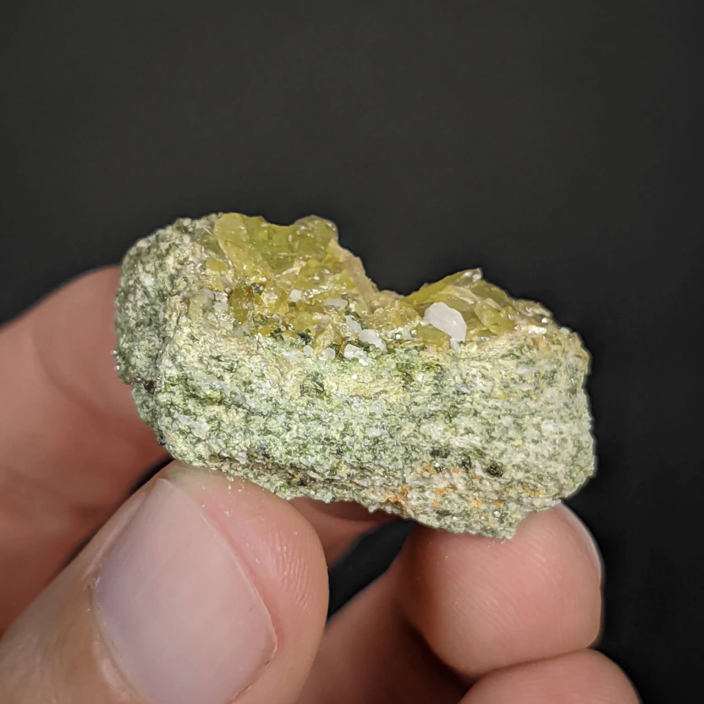Exemplar do mineral titanita, também conhecido como esfênio, de cor verde-amarelado, acompanhado pelos minerais epídoto verde-escuro e albita branca. Esta peça possui 3,3 cm. De origem brasileira, essa associação multiespécie mineral é rara, bem cristalizada e altamente valorizada em coleções.